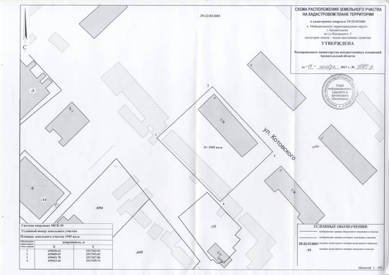 2. Адрес месторасположения земельного участка: г. Архангельск, ул. Котовского, д. 5. Данный земельный участок расположен в кадастровом квартале 29:22: 012601. Утвержденная схема расположения земельного участка: