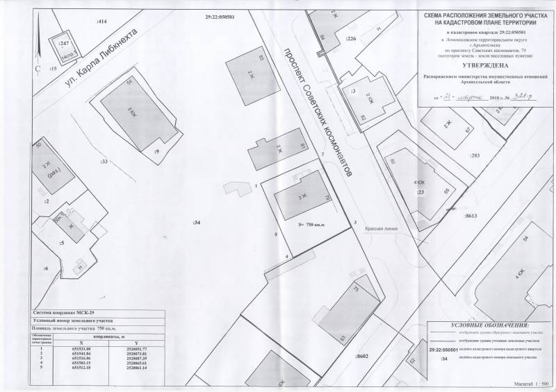 2. Адрес месторасположения земельного участка: г. Архангельск, пр. Советских космонавтов, д. 79. Данный земельный участок расположен в кадастровом квартале 29:22:050501. Утвержденная схема расположения земельного участка: