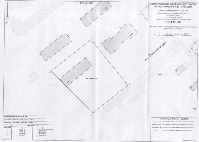 2. Адрес месторасположения земельного участка: г. Архангельск, ул. Стахановская, д. 49. Данный земельный участок расположен в кадастровом квартале 29:22:011302. Утвержденная схема расположения земельного участка: