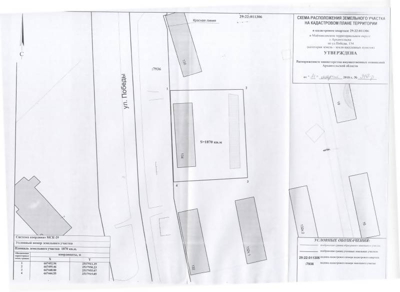 2. Адрес месторасположения земельного участка: г. Архангельск, ул. Победы, д. 134. Данный земельный участок расположен в кадастровом квартале 29:22:011306. Утвержденная схема расположения земельного участка: