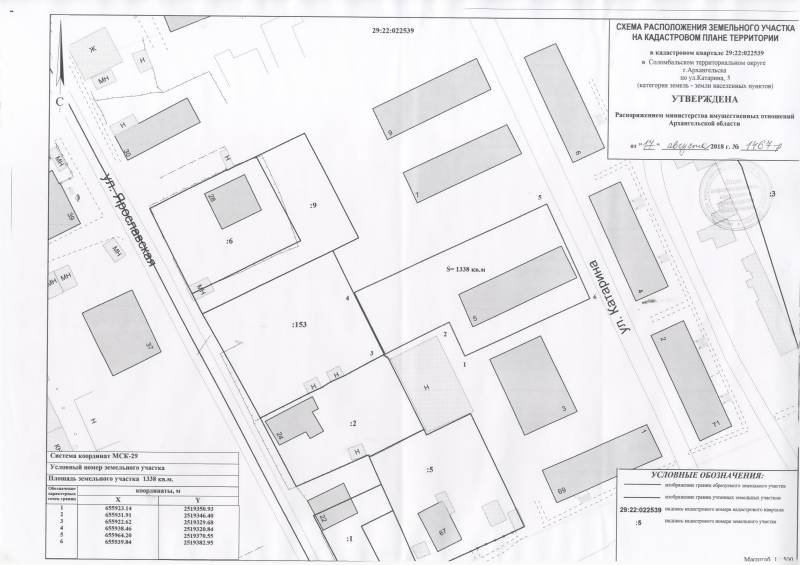 2. Адрес месторасположения земельного участка: г. Архангельск, ул. Катарина, д. 5. Данный земельный участок расположен в кадастровом квартале 29:22:022539. Утвержденная схема расположения земельного участка: