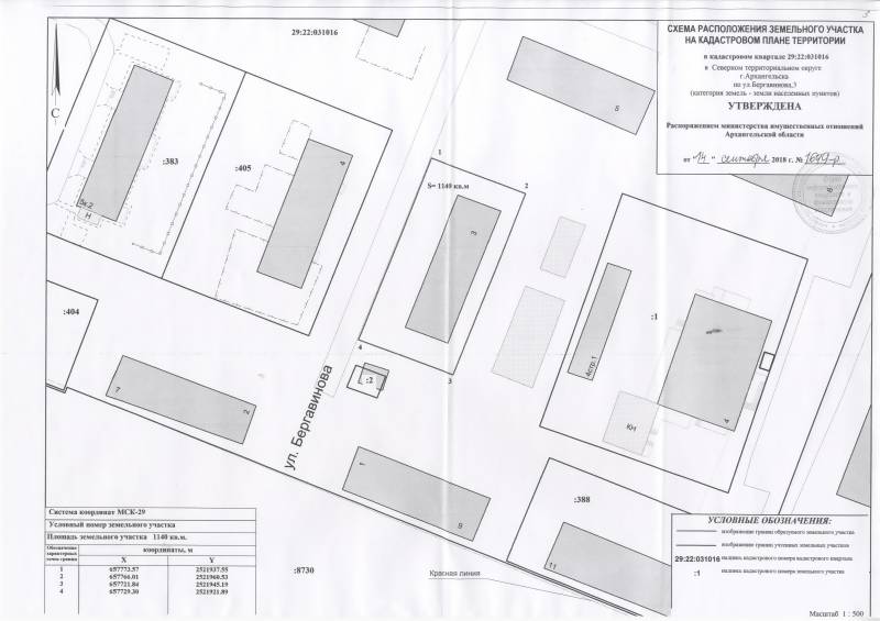 2. Адрес месторасположения земельного участка: г. Архангельск, ул. Бергавинова, д. 3. Данный земельный участок расположен в кадастровом квартале 29:22:031016. Утвержденная схема расположения земельного участка: