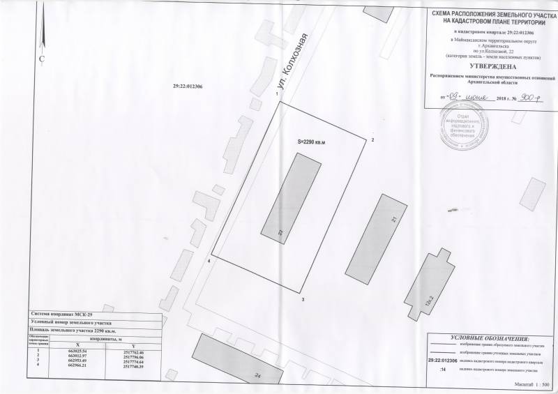 2. Адрес месторасположения земельного участка: г. Архангельск, ул. Колхозная, д. 22. Данный земельный участок расположен в кадастровом квартале 29:22:012306. Утвержденная схема расположения земельного участка: