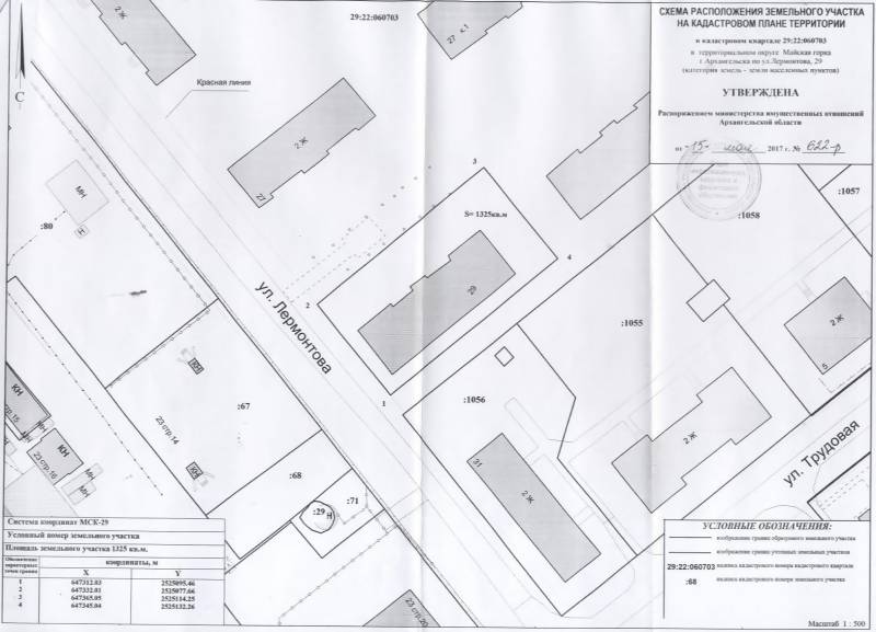 2. Адрес месторасположения земельного участка: г. Архангельск, ул. Лермонтова, д. 29. Данный земельный участок расположен в кадастровом квартале 29:22:060703. Утвержденная схема расположения земельного участка:
