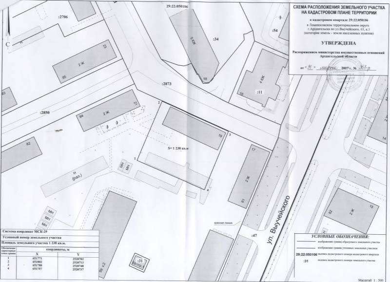 2. Адрес месторасположения земельного участка: г. Архангельск, ул. Выучейского, д. 63, корп. 1. Данный земельный участок расположен в кадастровом квартале 29:22:050106. Утвержденная схема расположения земельного участка: