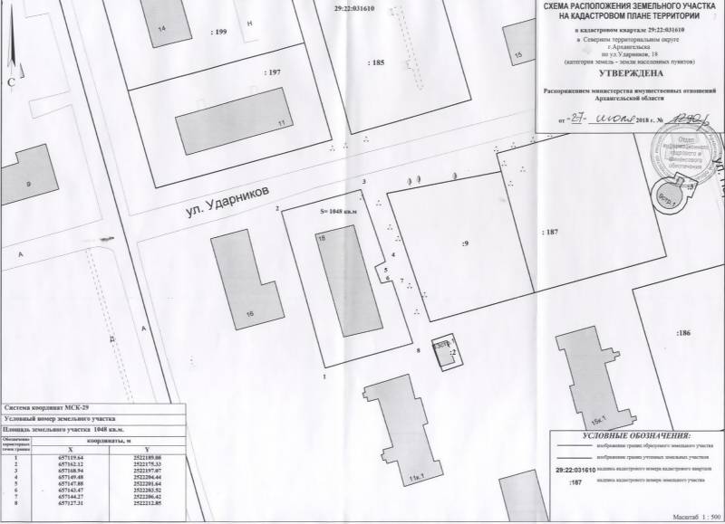 2. Адрес месторасположения земельного участка: г. Архангельск, ул. Ударников, д. 18. Данный земельный участок расположен в кадастровом квартале 29:22:031610. Утвержденная схема расположения земельного участка: