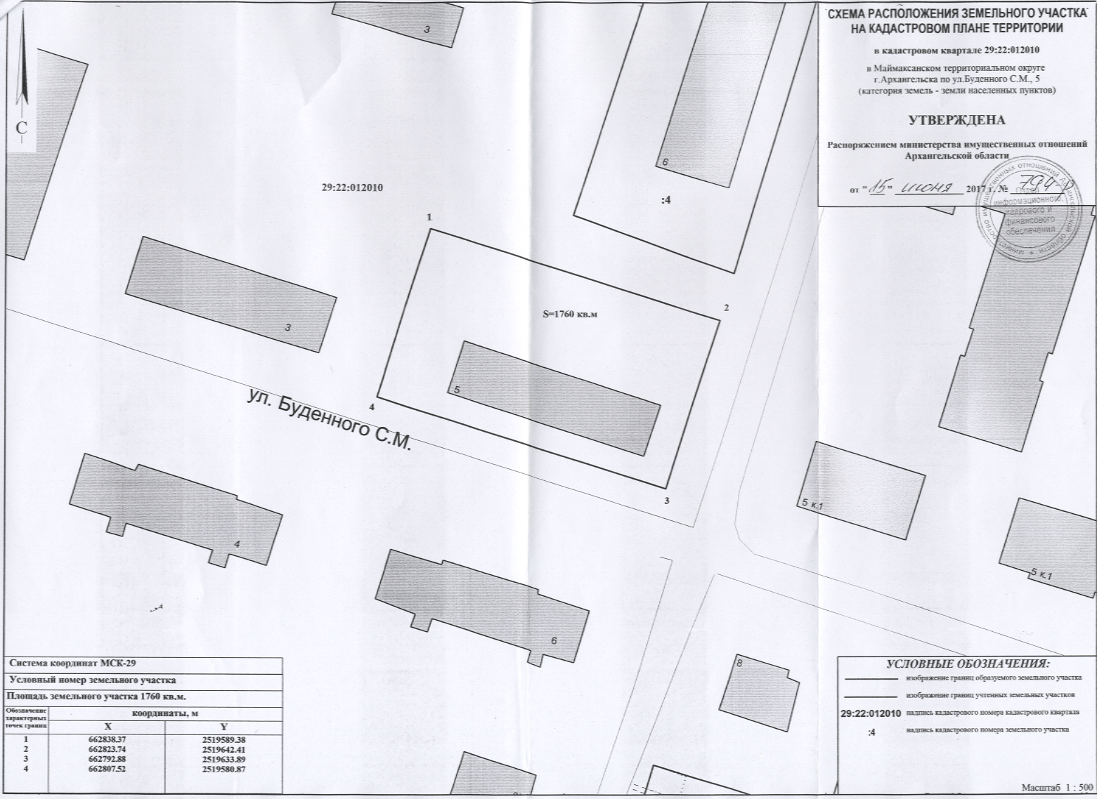 2. Адрес месторасположения земельного участка: г. Архангельск, ул. Буденного, д. 5. Данный земельный участок расположен в кадастровом квартале 29:22:012010. Утвержденная схема расположения земельного участка: