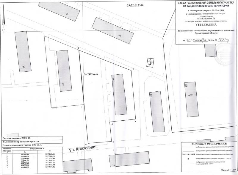 2. Адрес месторасположения земельного участка: г. Архангельск, ул. Колхозная, д. 28. Данный земельный участок расположен в кадастровом квартале 29:22:012306. Утвержденная схема расположения земельного участка:
