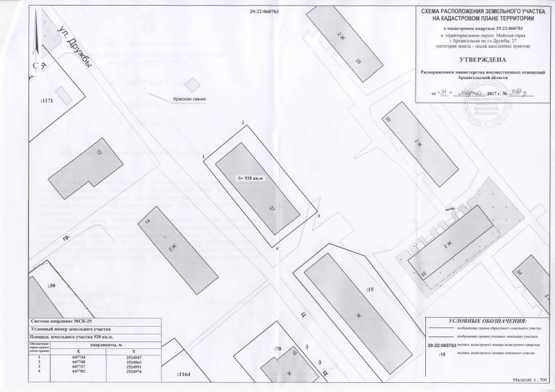 2. Адрес месторасположения земельного участка: г. Архангельск, ул. Дружбы, д. 24. Данный земельный участок расположен в кадастровом квартале 29:22:060703. Утвержденная схема расположения земельного участка: