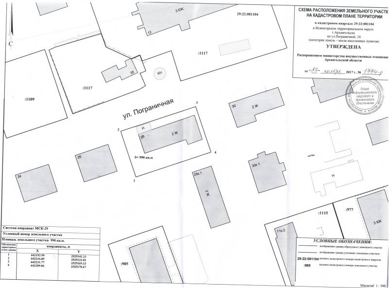 2. Адрес месторасположения земельного участка: г. Архангельск, ул. Пограничная, д. 28. Данный земельный участок расположен в кадастровом квартале 29:22:081104. Утвержденная схема расположения земельного участка: