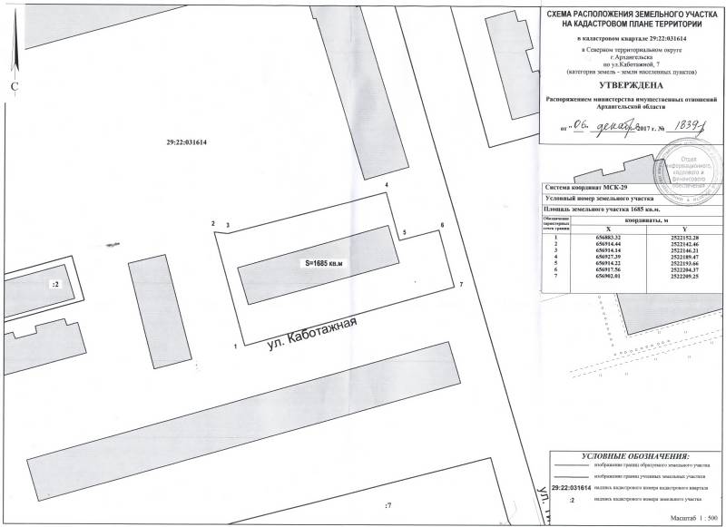 2. Адрес месторасположения земельного участка: г. Архангельск, ул. Каботажная, д. 7. Данный земельный участок расположен в кадастровом квартале 29:22:031614. Утвержденная схема расположения земельного участка: