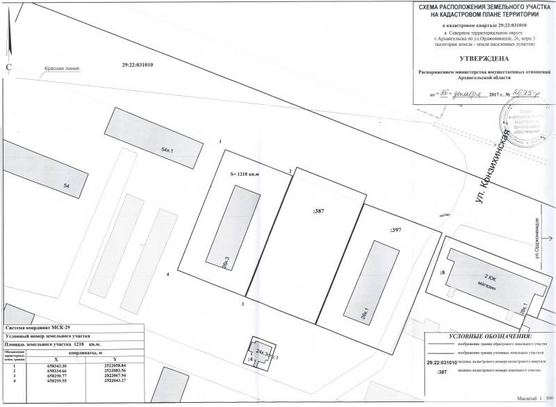 2. Адрес месторасположения земельного участка: г. Архангельск, ул. Орджоникидзе, д. 26, корп. 3. Данный земельный участок расположен в кадастровом квартале 29:22:031010. Утвержденная схема расположения земельного участка: