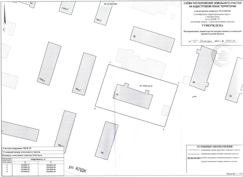 2. Адрес месторасположения земельного участка: г. Архангельск, ул. КЛДК, д. 97. Данный земельный участок расположен в кадастровом квартале 29:22:041201. Утвержденная схема расположения земельного участка: