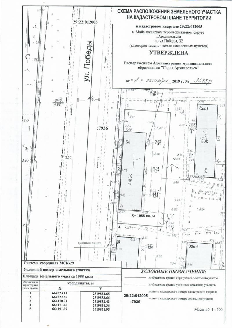 2. Адрес месторасположения земельного участка: г. Архангельск, ул. Победы, д. 32. Данный земельный участок расположен в кадастровом квартале 29:22:012005. Утвержденная схема расположения земельного участка: