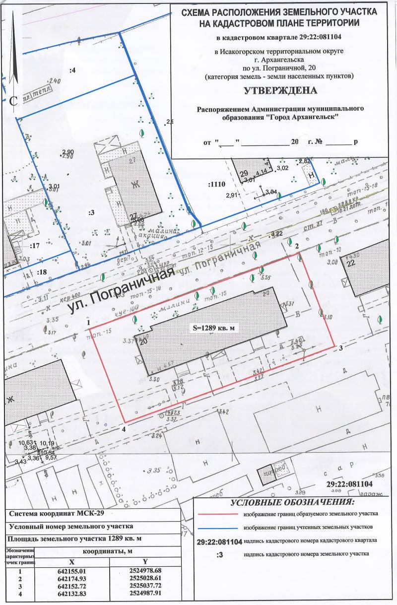 2. Адрес месторасположения земельного участка: г. Архангельск, ул. Пограничная, д. 20. Данный земельный участок расположен в кадастровом квартале 29:22:081104. Планируемая к утверждению схема расположения земельного участка: