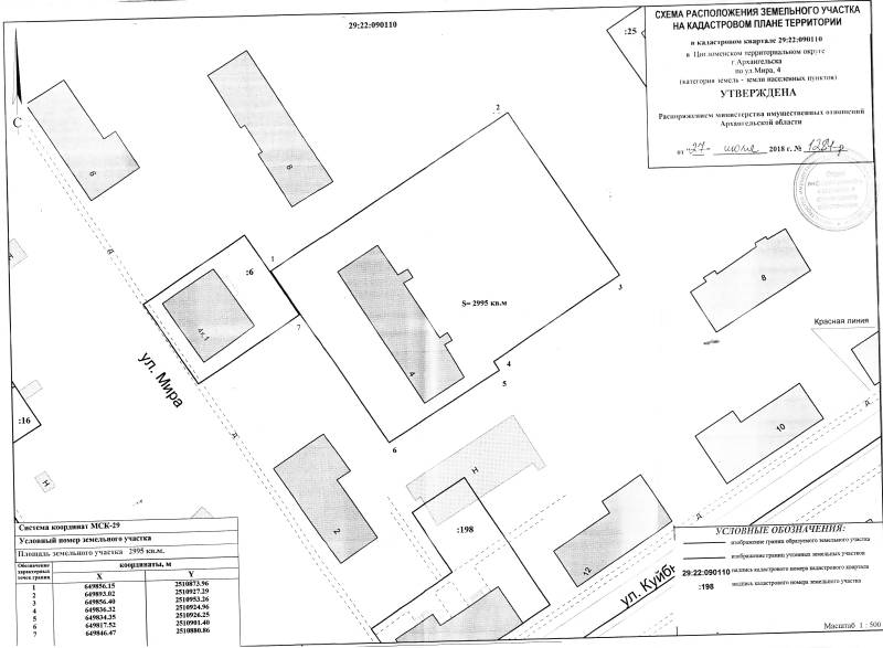 2. Адрес месторасположения земельного участка: г. Архангельск, ул. Мира, д. 4. Данный земельный участок расположен в кадастровом квартале 29:22:090110. Утвержденная схема расположения земельного участка: