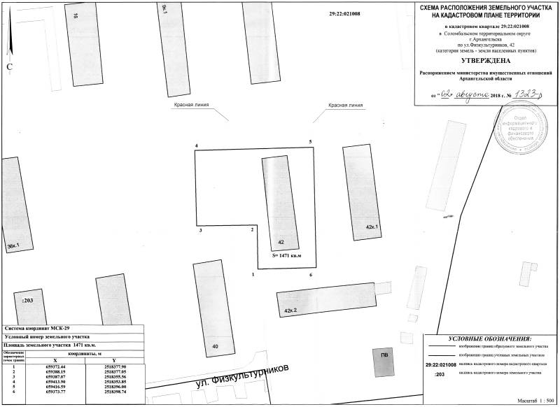 2. Адрес месторасположения земельного участка: г. Архангельск, ул. Физкультурников, д. 42. Данный земельный участок расположен в кадастровом квартале 29:22:021008. Утвержденная схема расположения земельного участка: