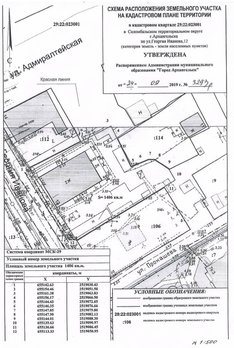2. Адрес месторасположения земельного участка: г. Архангельск, ул. Георгия Иванова, д. 12. Данный земельный участок расположен в кадастровом квартале 29:22:023001. Утвержденная схема расположения земельного участка: