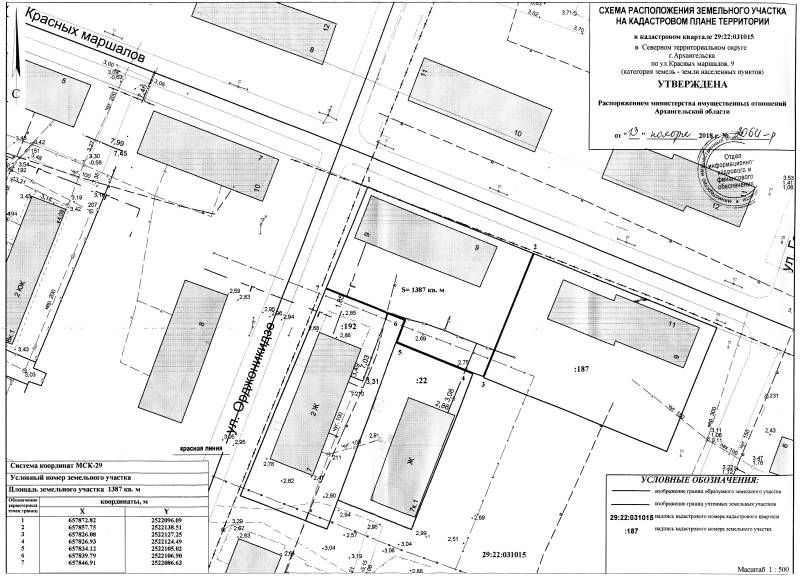 2. Адрес месторасположения земельного участка: г. Архангельск, ул. Красных маршалов, д. 9. Данный земельный участок расположен в кадастровом квартале 29:22:031015. Утвержденная схема расположения земельного участка: