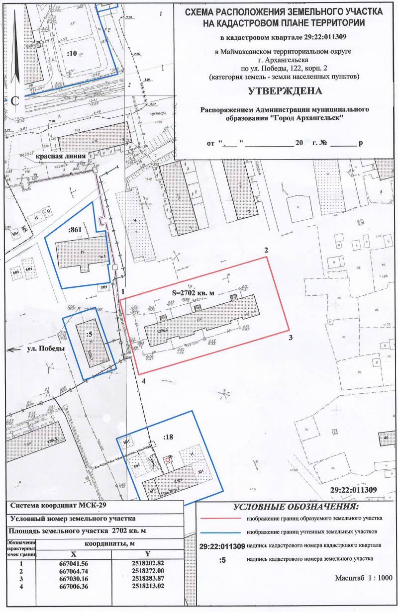 2. Адрес месторасположения земельного участка: г. Архангельск, ул. Победы, д. 122, корп. 2. Данный земельный участок расположен в кадастровом квартале 29:22:011309. Планируемая к утверждению схема расположения земельного участка: