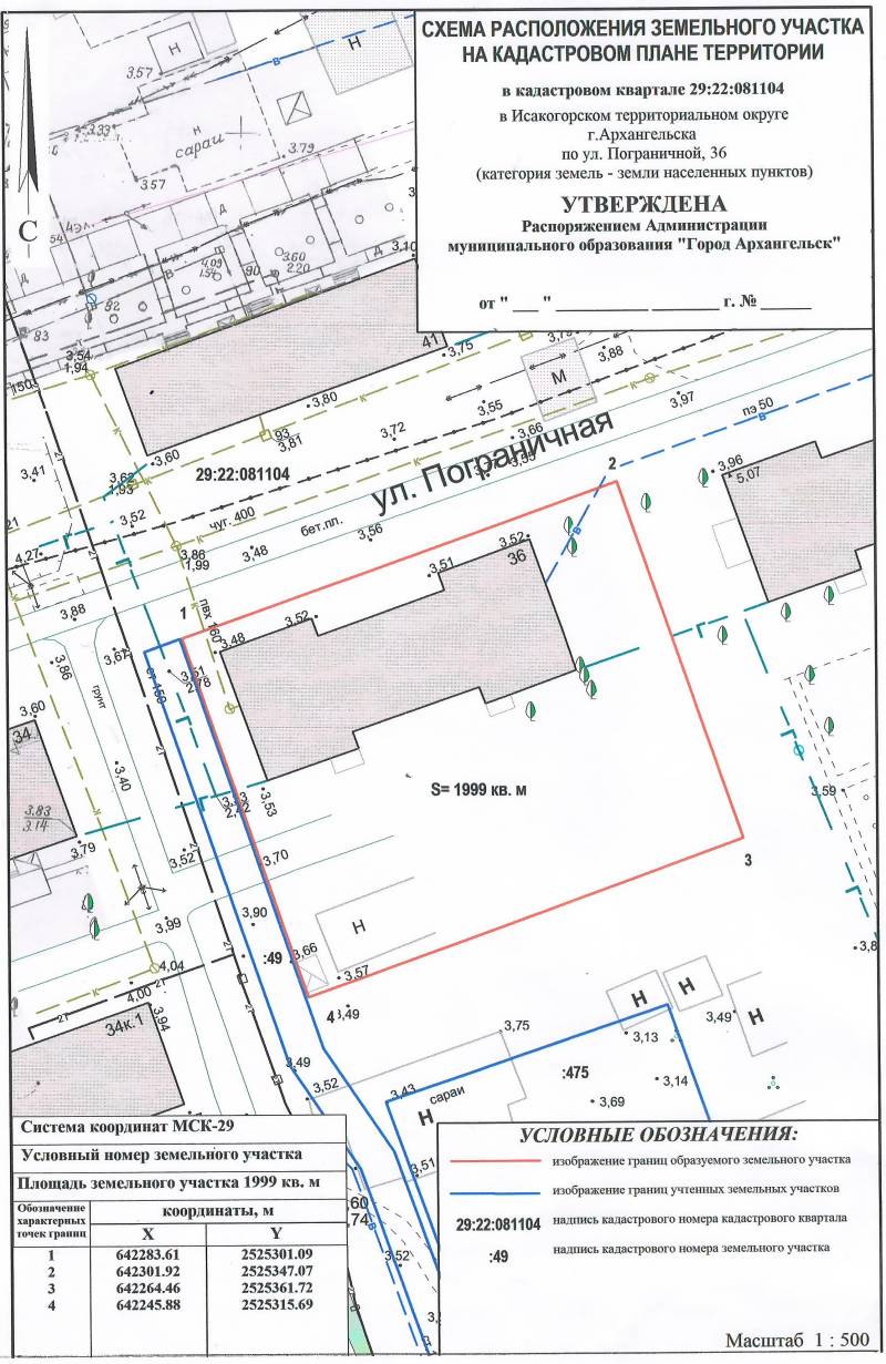 2. Адрес месторасположения земельного участка: г. Архангельск, ул. Пограничная, д. 36. Данный земельный участок расположен в кадастровом квартале 29:22:081104. Планируемая к утверждению схема расположения земельного участка: