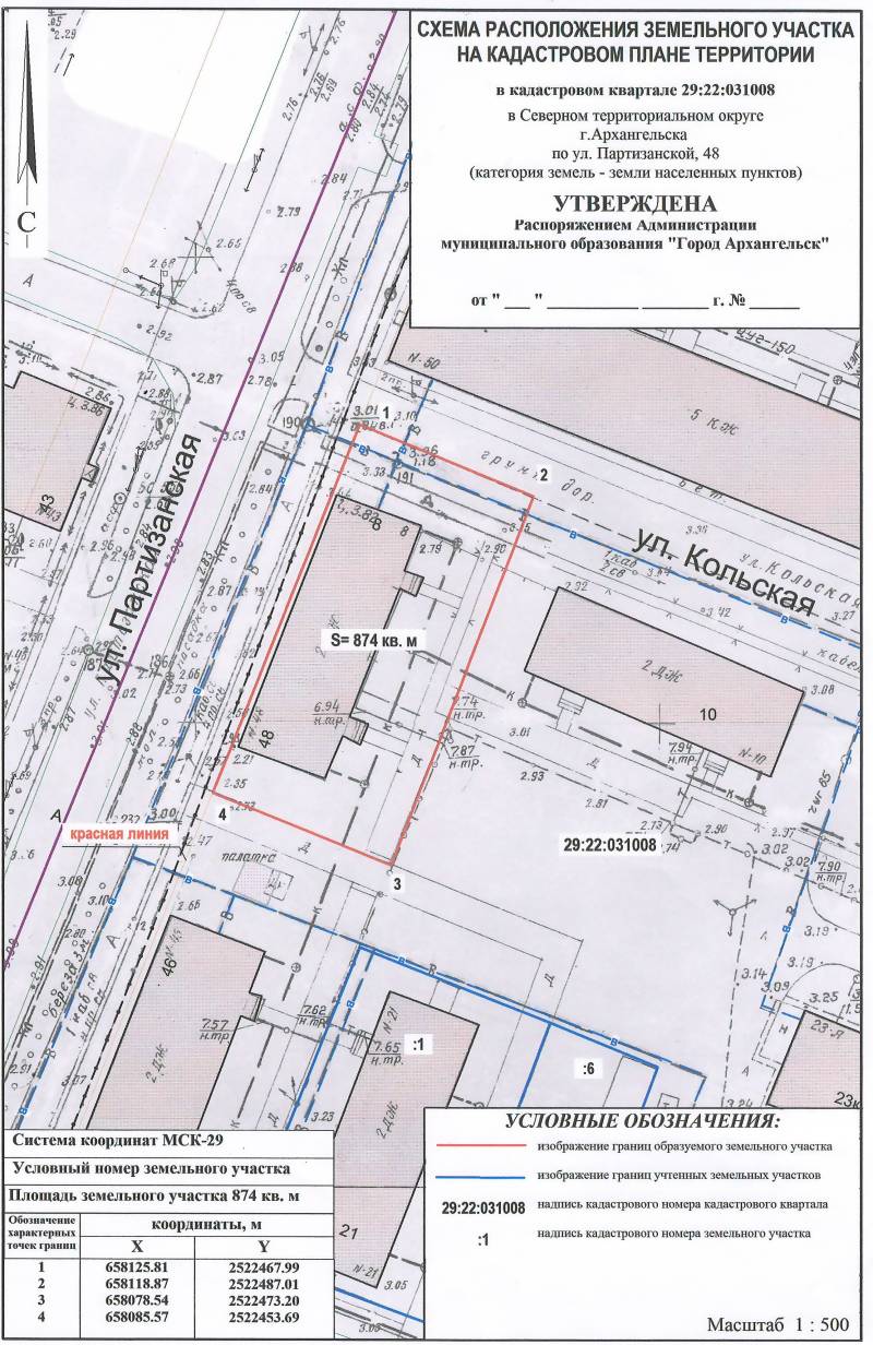 2. Адрес месторасположения земельного участка: г. Архангельск, ул. Партизанская, д. 48. Данный земельный участок расположен в кадастровом квартале 29:22:031008. Планируемая к утверждению схема расположения земельного участка: