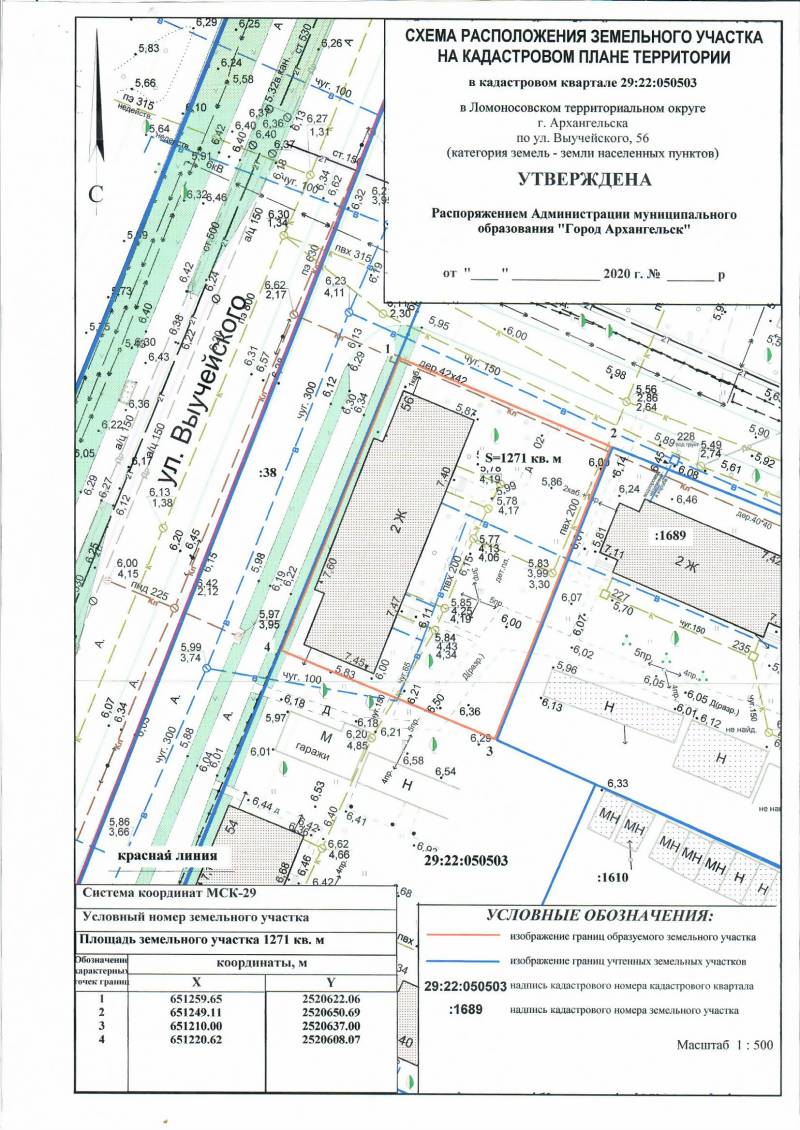 2. Адрес месторасположения земельного участка: г. Архангельск, ул. Выучейского, д. 56. Данный земельный участок расположен в кадастровом квартале 29:22:050503. Планируемая к утверждению схема расположения земельного участка: