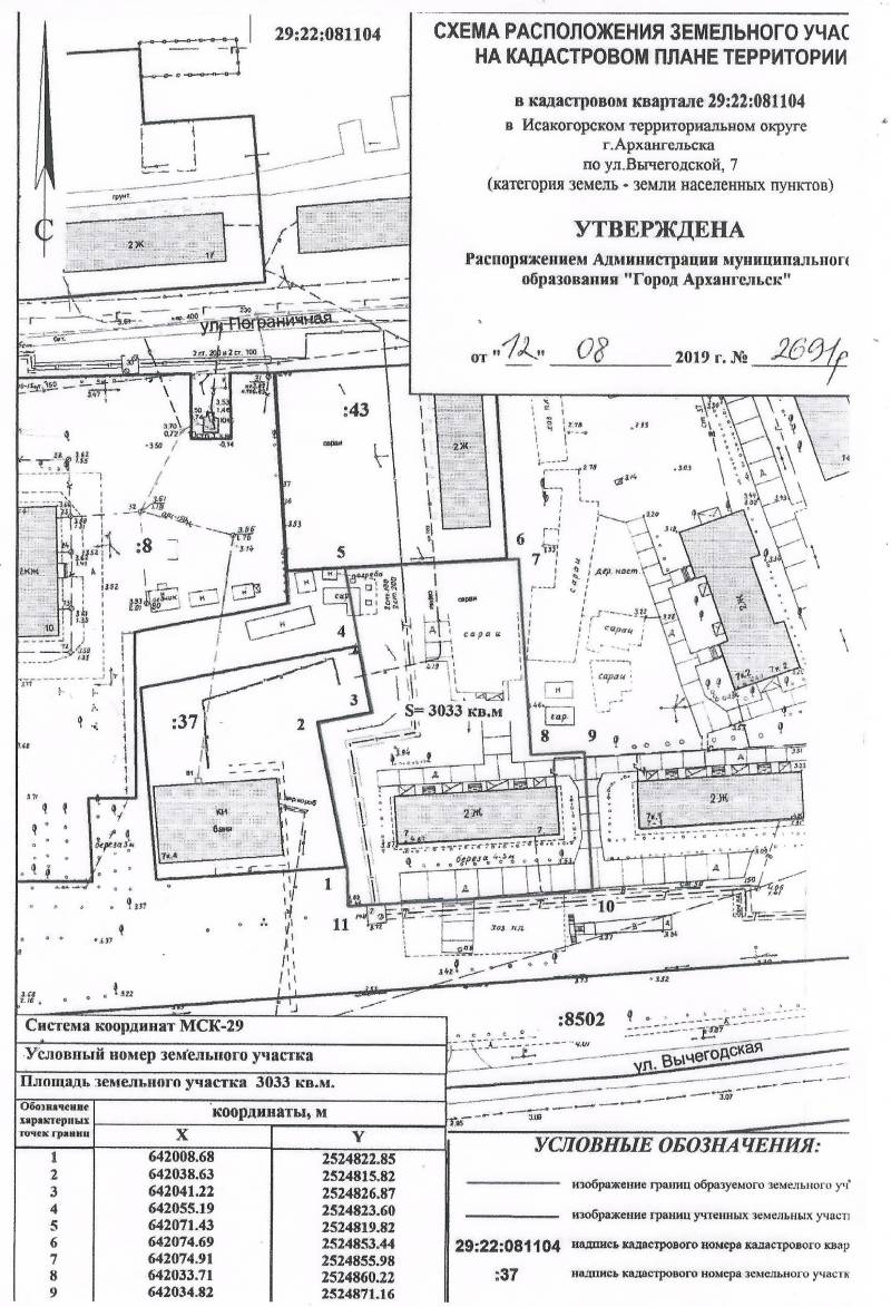 2. Адрес месторасположения земельного участка: г. Архангельск, ул. Вычегодская, д. 7. Данный земельный участок расположен в кадастровом квартале 29:22:081104. Утвержденная схема расположения земельного участка: