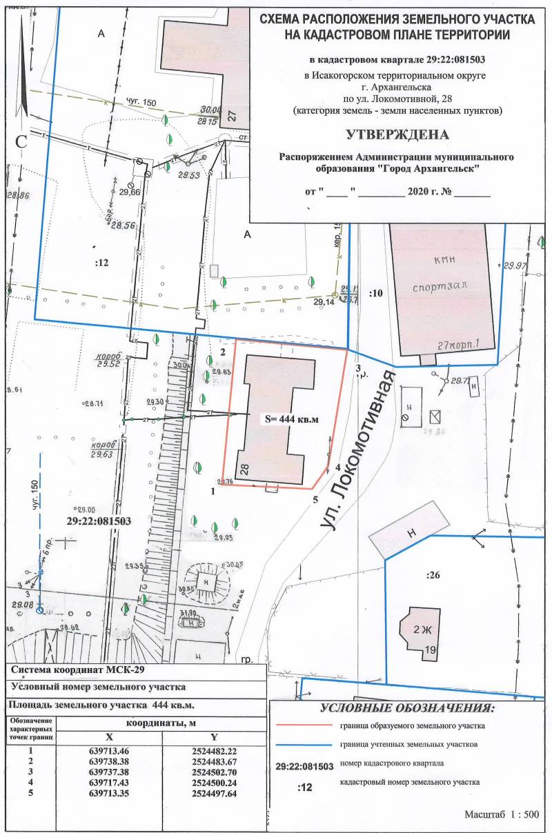 2. Адрес месторасположения земельного участка: г. Архангельск, ул. Локомотивная, д. 28. Данный земельный участок расположен в кадастровом квартале 29:22:081503. Планируемая к утверждению схема расположения земельного участка: