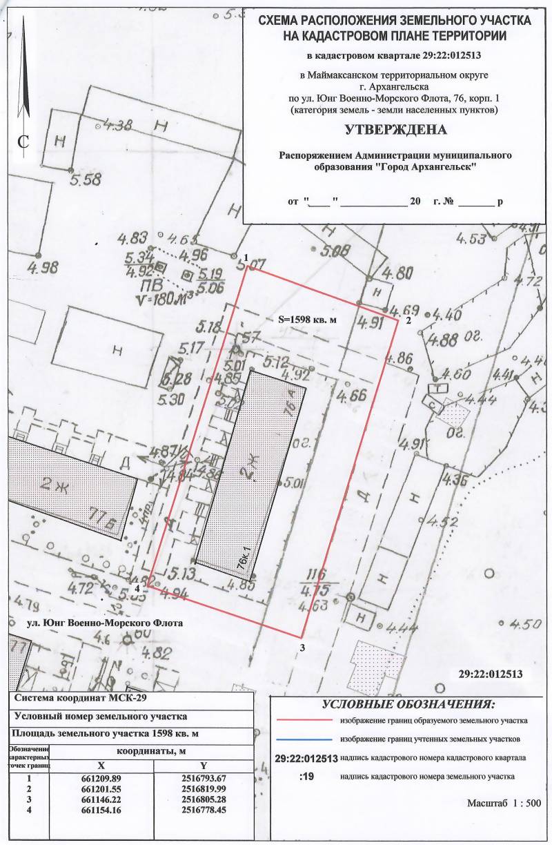 2. Адрес месторасположения земельного участка: г. Архангельск, ул. Юнг Военно-Морского Флота, д. 76, корп. 1. Данный земельный участок расположен в кадастровом квартале 29:22:012513. Планируемая к утверждению схема расположения земельного участка: