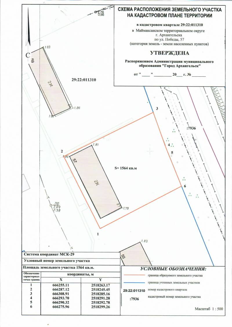 2. Адрес месторасположения земельного участка: г. Архангельск, ул. Победы, д. 57. Данный земельный участок расположен в кадастровом квартале 29:22:011310. Планируемая к утверждению схема расположения земельного участка: