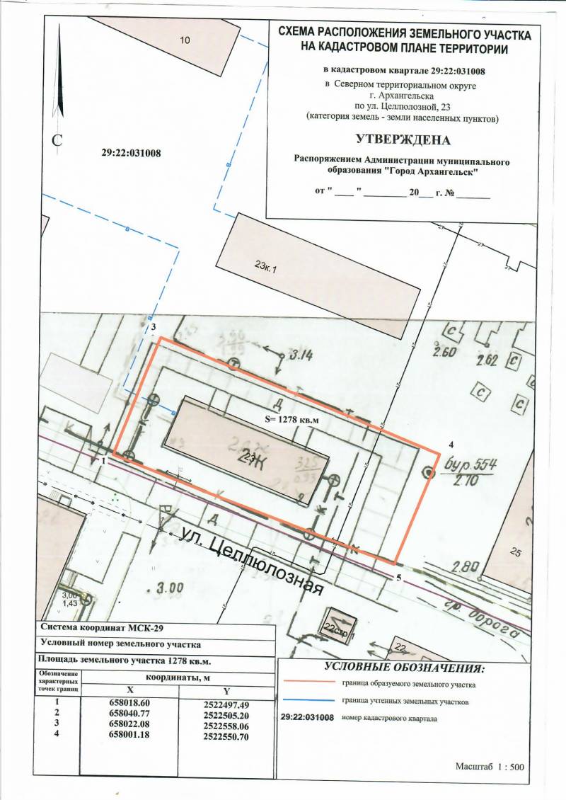 2. Адрес месторасположения земельного участка: г. Архангельск, ул. Целлюлозная, д. 23. Данный земельный участок расположен в кадастровом квартале 29:22:031008. Планируемая к утверждению схема расположения земельного участка: