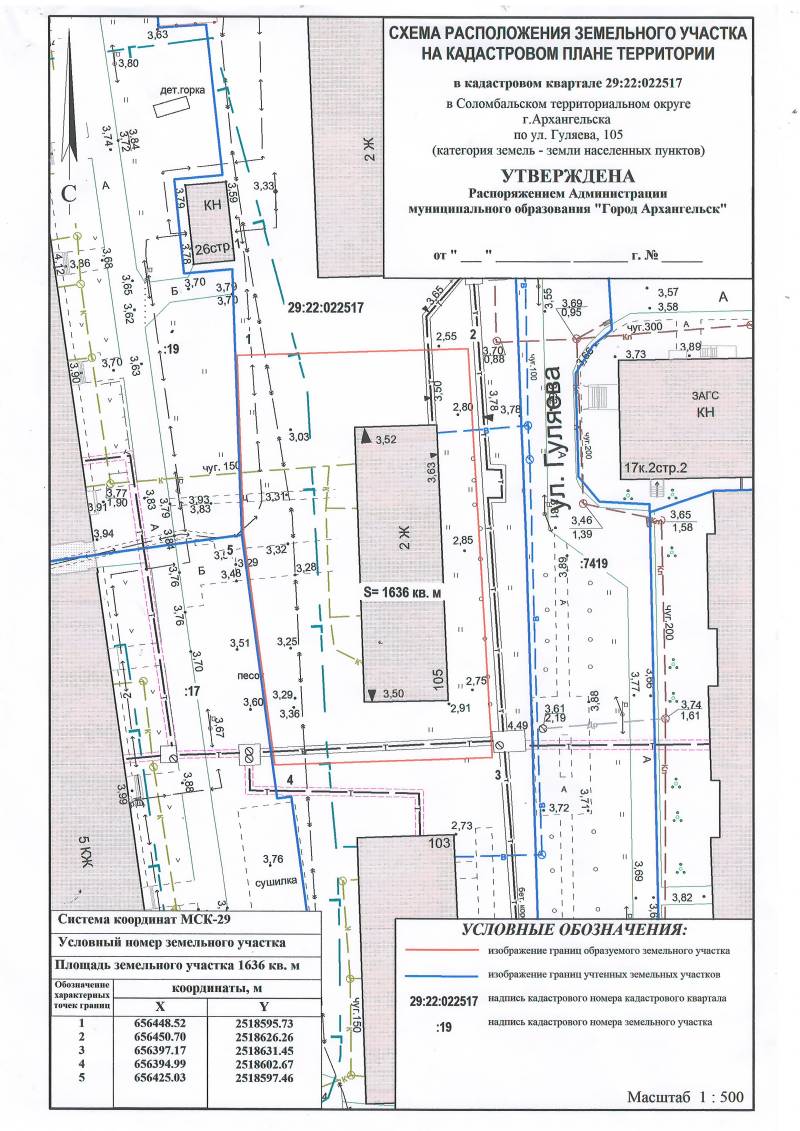 2. Адрес месторасположения земельного участка: г. Архангельск, ул. Гуляева, д. 105. Данный земельный участок расположен в кадастровом квартале 29:22:022517. Планируемая к утверждению схема расположения земельного участка: