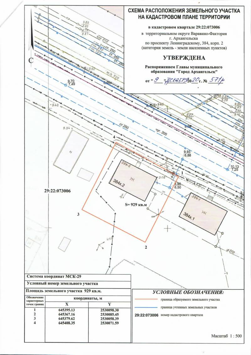 2. Адрес месторасположения земельного участка: г. Архангельск, просп. Ленинградский, д. 384, корп. 2. Данный земельный участок расположен в кадастровом квартале 29:22:073006. Утвержденная схема расположения земельного участка: