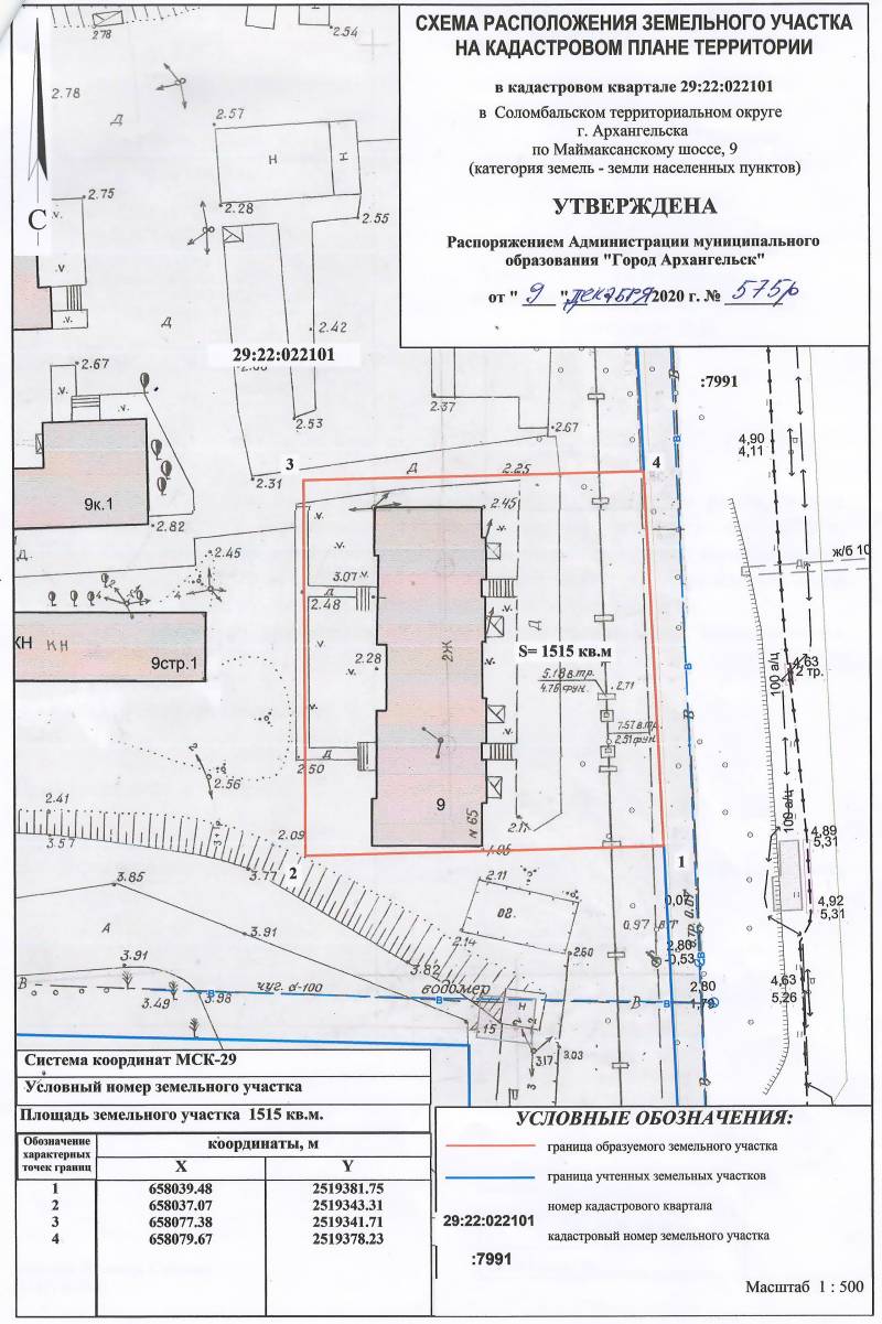 2. Адрес месторасположения земельного участка: г. Архангельск, Маймаксанское шоссе, д. 9. Данный земельный участок расположен в кадастровом квартале 29:22:022101. Утвержденная схема расположения земельного участка: