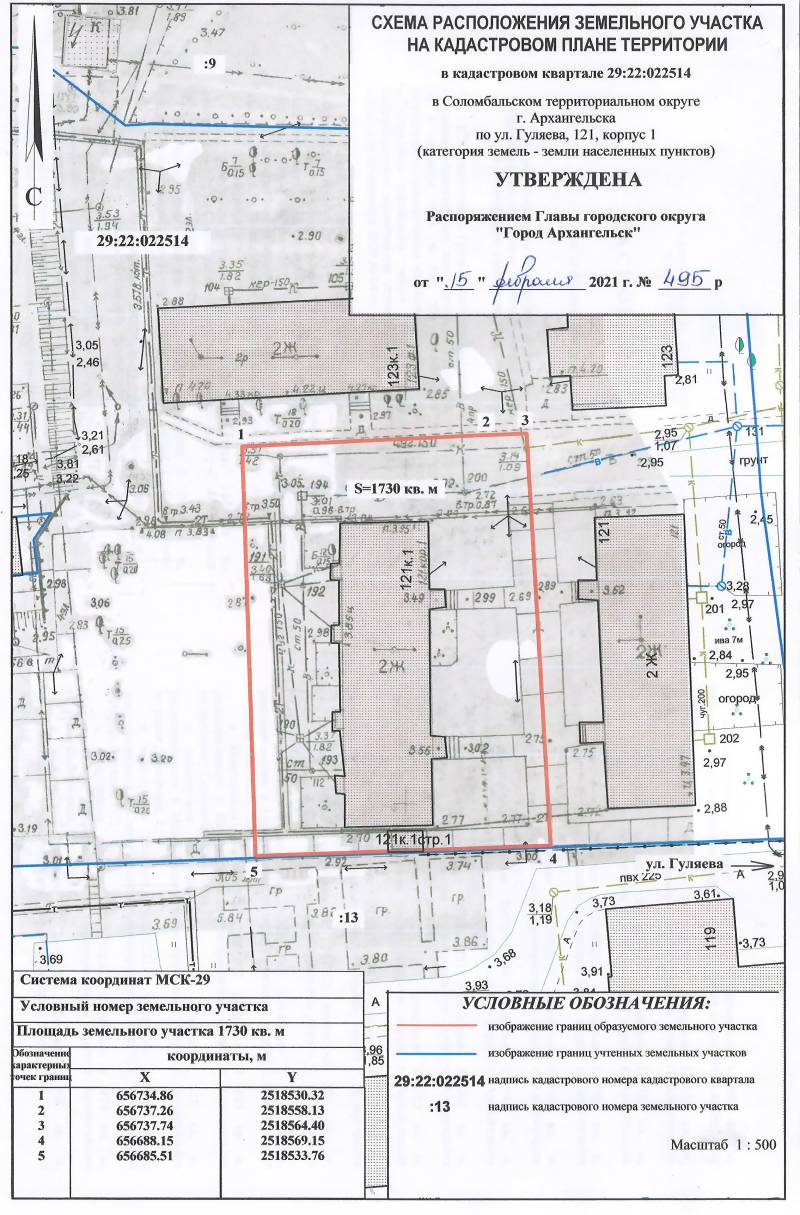 д. 121, корп. 1. Данный земельный участок расположен в кадастровом квартале 29:22:022514. Утвержденная схема расположения земельного участка: