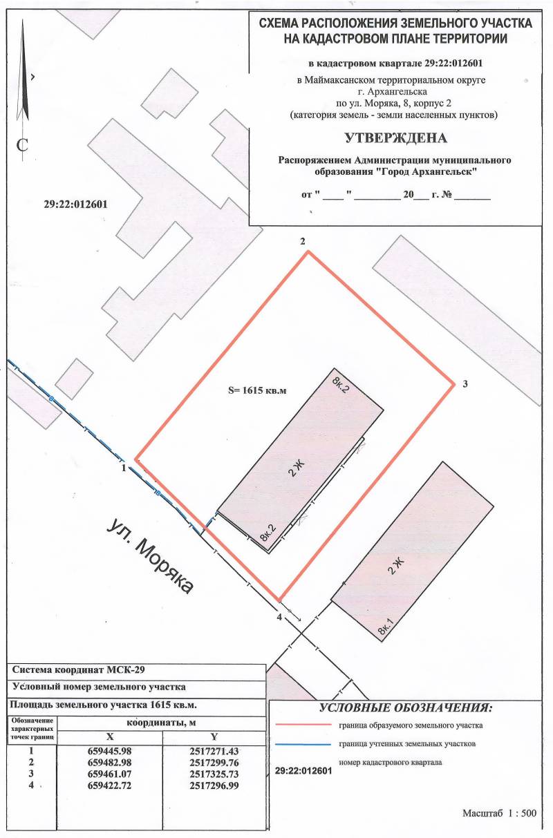 2. Адрес месторасположения земельного участка: г. Архангельск, ул. Моряка, д. 8, корп. 2. Данный земельный участок расположен в кадастровом квартале 29:22:012601. Планируемая к утверждению схема расположения земельного участка: