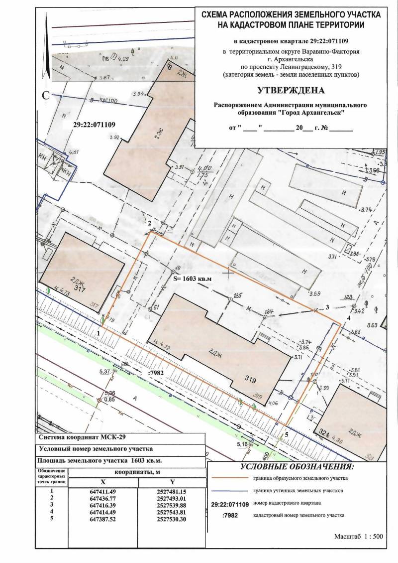 просп. Ленинградский, д. 319. Данный земельный участок расположен в кадастровом квартале 29:22:071109. Планируемая к утверждению схема расположения земельного участка: