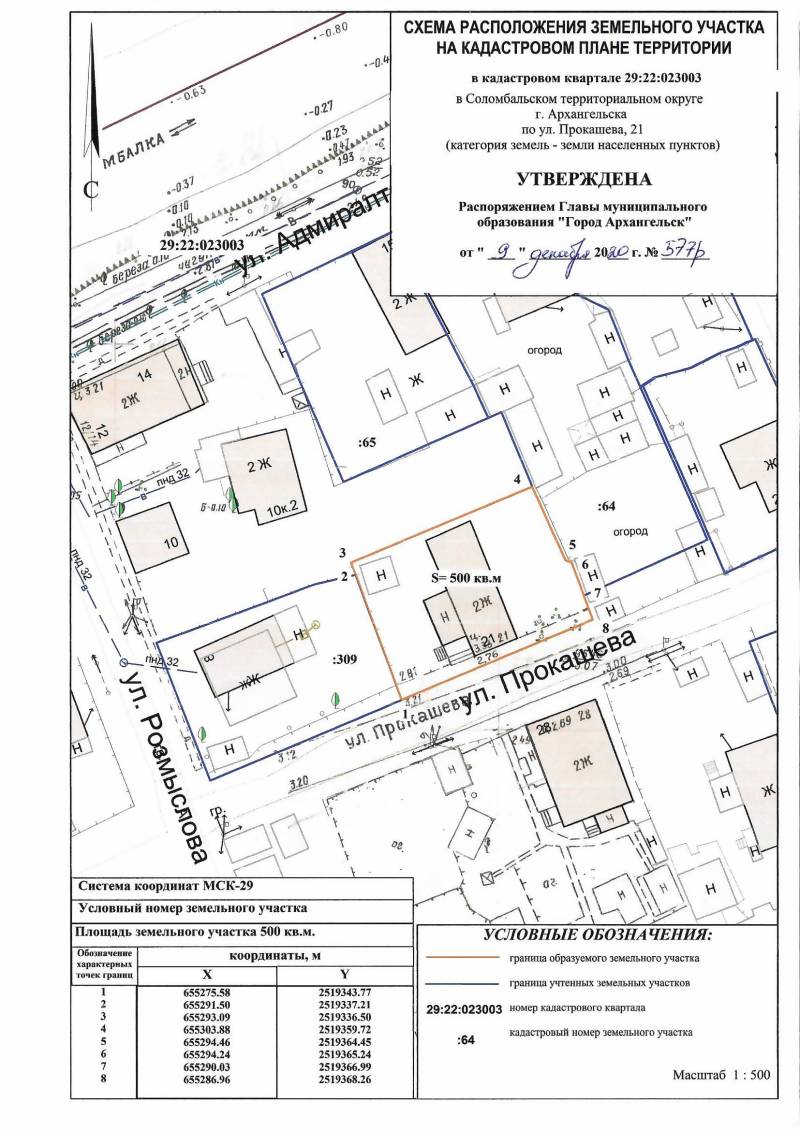2. Адрес месторасположения земельного участка: г. Архангельск, ул. Прокашева, д. 21. Данный земельный участок расположен в кадастровом квартале 29:22:023003. Утвержденная схема расположения земельного участка: