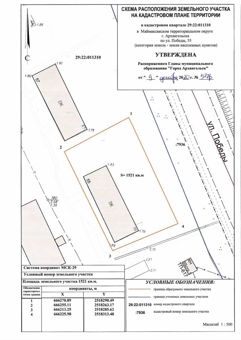 2. Адрес месторасположения земельного участка: г. Архангельск, ул. Победы, д. 55. Данный земельный участок расположен в кадастровом квартале 29:22:011310. Утвержденная схема расположения земельного участка: