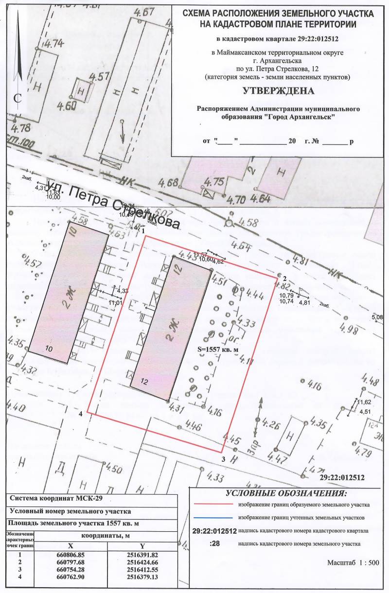 2. Адрес месторасположения земельного участка: г. Архангельск, ул. Петра Стрелкова, д. 12. Данный земельный участок расположен в кадастровом квартале 29:22:012512. Планируемая к утверждению схема расположения земельного участка: