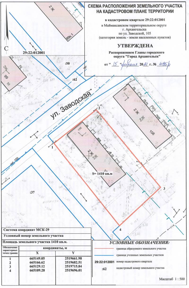 д. 105. Данный земельный участок расположен в кадастровом квартале 29:22:012001. Утвержденная схема расположения земельного участка: