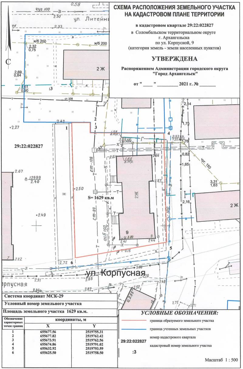 2. Адрес месторасположения земельного участка: г. Архангельск, ул. Корпусная, д. 9. Данный земельный участок расположен в кадастровом квартале 29:22:022827. Планируемая к утверждению схема расположения земельного участка: