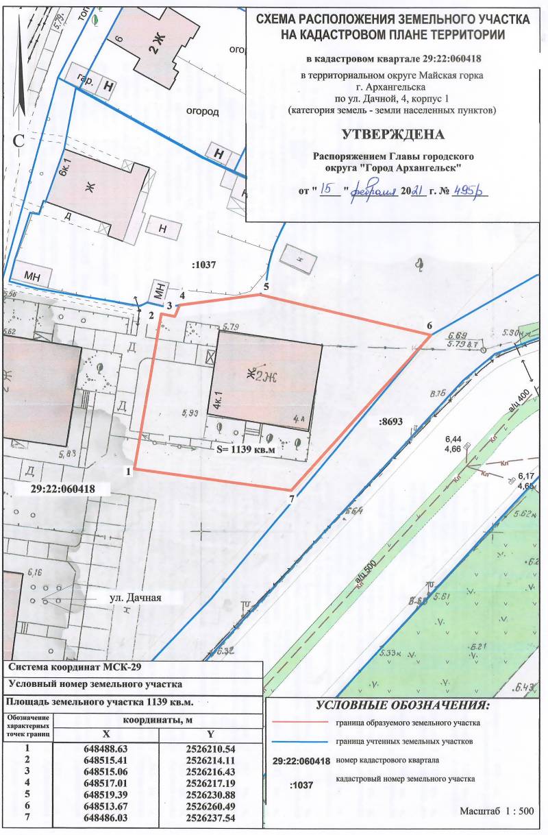 д. 4, корп. 1. Данный земельный участок расположен в кадастровом квартале 29:22:060418. Утвержденная схема расположения земельного участка: