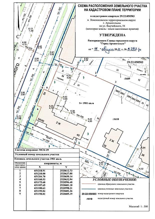 2. Адрес месторасположения земельного участка: г. Архангельск, ул. Выучейского, д. 54. Данный земельный участок расположен в кадастровом квартале 29:22:050503. Схема расположения земельного участка: