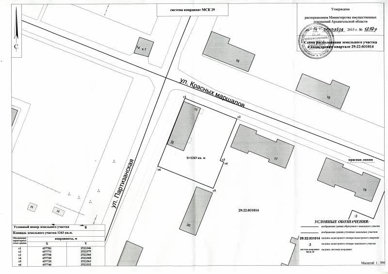 2. Адрес месторасположения земельного участка: г. Архангельск, ул. Партизанская, д. 32/ул. Красных маршалов, 15. Данный земельный участок расположен в кадастровом квартале 29:22:031014. Утвержденная схема расположения земельного участка: