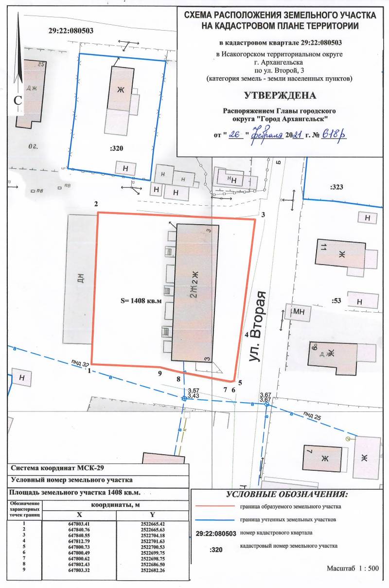 д. 3. Данный земельный участок расположен в кадастровом квартале 29:22:080503. Утвержденная схема расположения земельного участка: