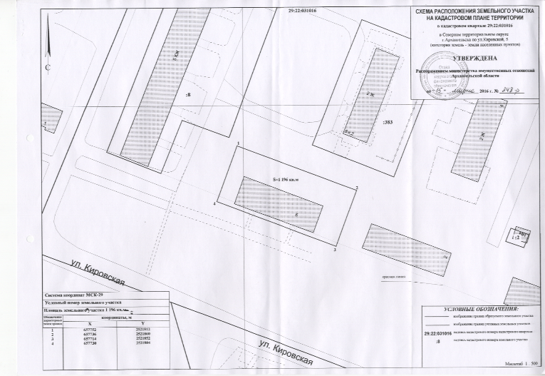 2. Адрес месторасположения земельного участка: г. Архангельск, ул. Кировская, 5. Данный земельный участок расположен в кадастровом квартале 29:22:031016. Утвержденная схема расположения земельного участка: