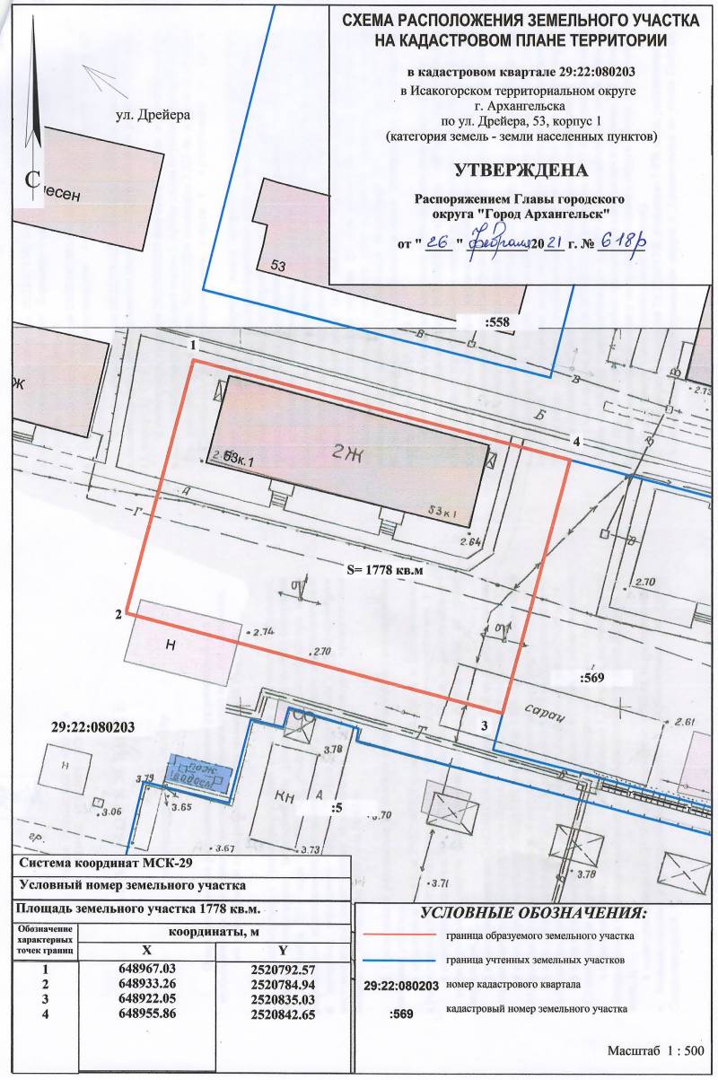 д. 53, корп. 1. Данный земельный участок расположен в кадастровом квартале 29:22:080203. Утвержденная схема расположения земельного участка: