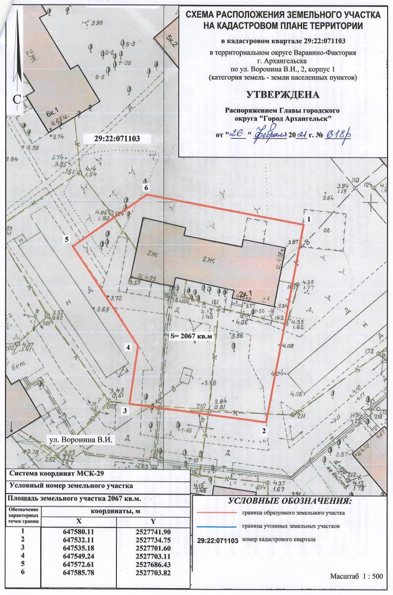 д. 2, корп. 1. Данный земельный участок расположен в кадастровом квартале 29:22:071103. Утвержденная схема расположения земельного участка: